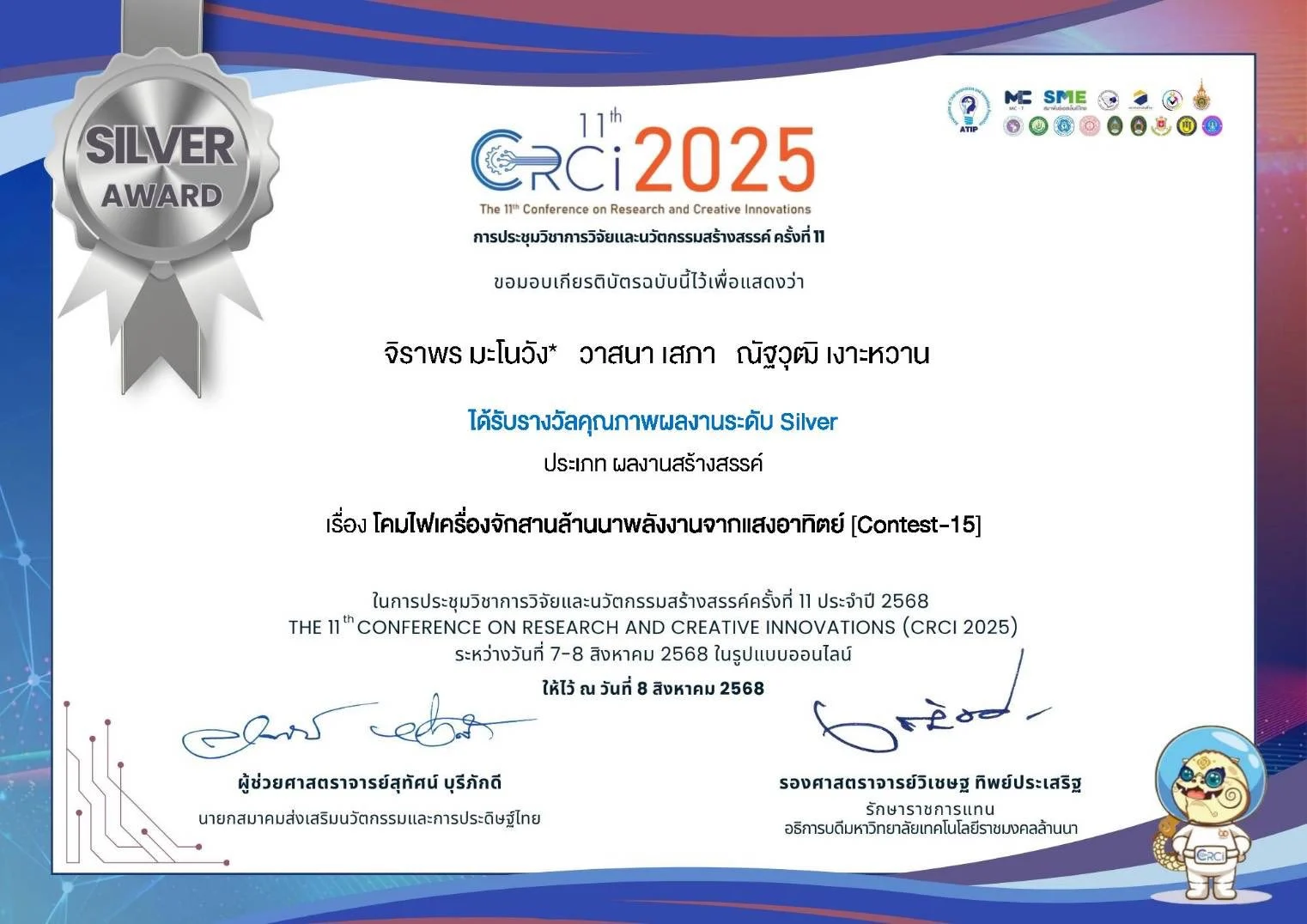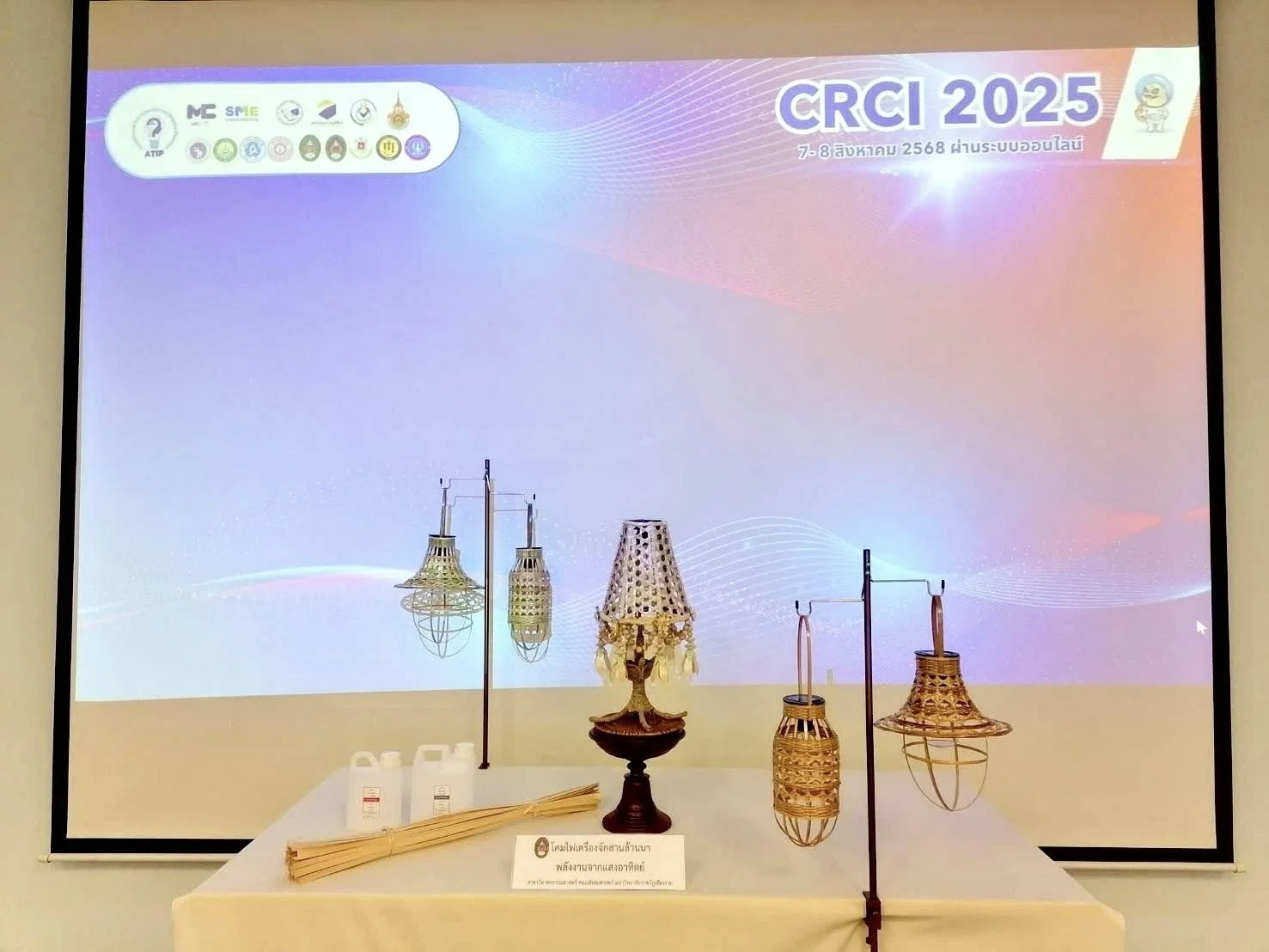วันที่ 7–8 สิงหาคม 2568 ผู้ช่วยศาตราจารย์ จิราพร มะโนวัง ผู้ช่วยศาสตราจารย์ วาสนา เสภา และ อาจารย์ ณัฐวุฒิ เงาะหวาน อาจารย์ประจำสาขาวิชาคหกรรมศาสตร์ คณะสังคมศาสตร์ มหาวิทยาลัยราชภัฏเชียงราย นำผลงานนวัตกรรม “โคมไฟเครื่องจักสานล้านนาพลังงานจากแสงอาทิตย์” เข้าร่วมการประกวดสิ่งประดิษฐ์ นวัตกรรม และผลงานสร้างสรรค์ ผ่านระบบออนไลน์ ในการประชุมวิชาการวิจัยและนวัตกรรมสร้างสรรค์ ครั้งที่ 11 (The 11th CRCI 2025) และการประชุมนานาชาติ The 9th International Symposium on Plasma & Fine Bubble (9th ISPFB 2025)