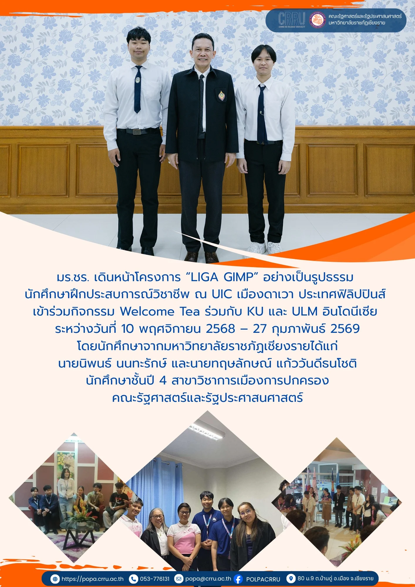 มหาวิทยาลัยราชภัฏเชียงราย (มร.ชร.) โดยการสนับสนุนของ รองศาสตราจารย์ ดร.ไพโรจน์ ด้วงนคร อธิการบดี เดินหน้าขับเคลื่อนโครงการ “LIGA GIMP (Global Internship & Mobility Program)” ภายใต้สถาบันภาษาและกิจการต่างประเทศ (LIGA) เพื่อส่งเสริมให้นักศึกษาได้รับประสบการณ์การเรียนรู้และฝึกปฏิบัติในระดับนานาชาติ